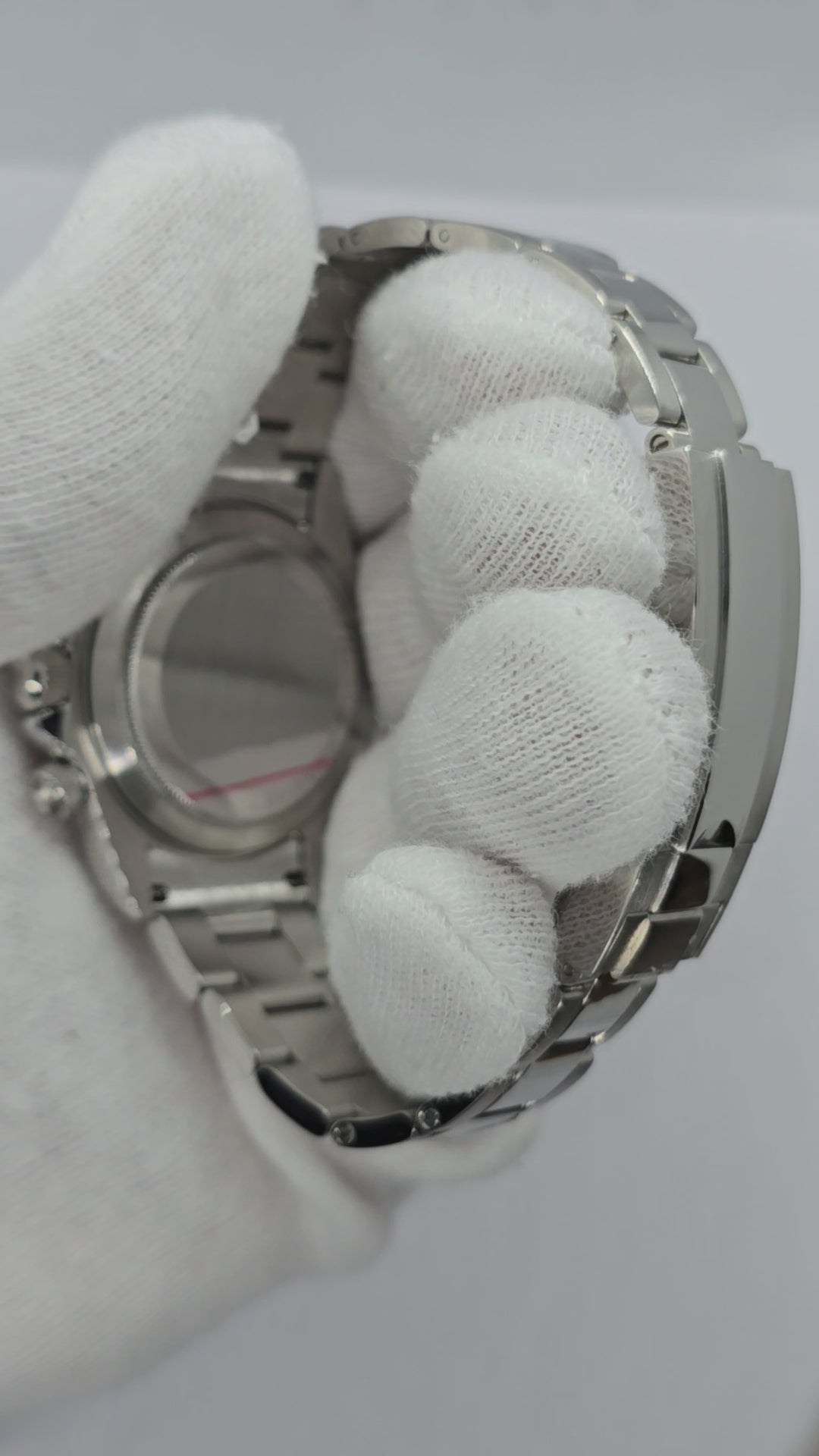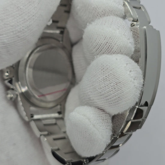 Cinturino Oyster in acciaio 316l con doppia chiusura di sicurezza e microregolazione.