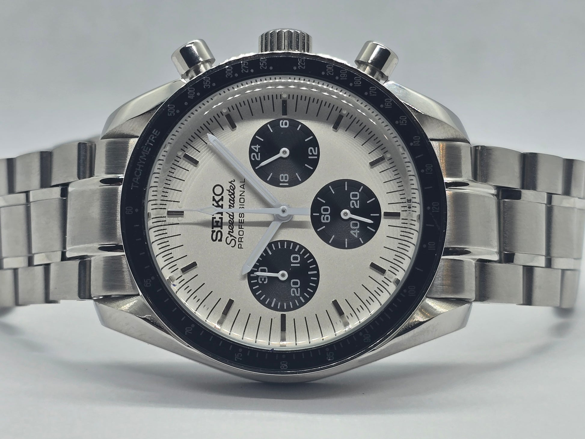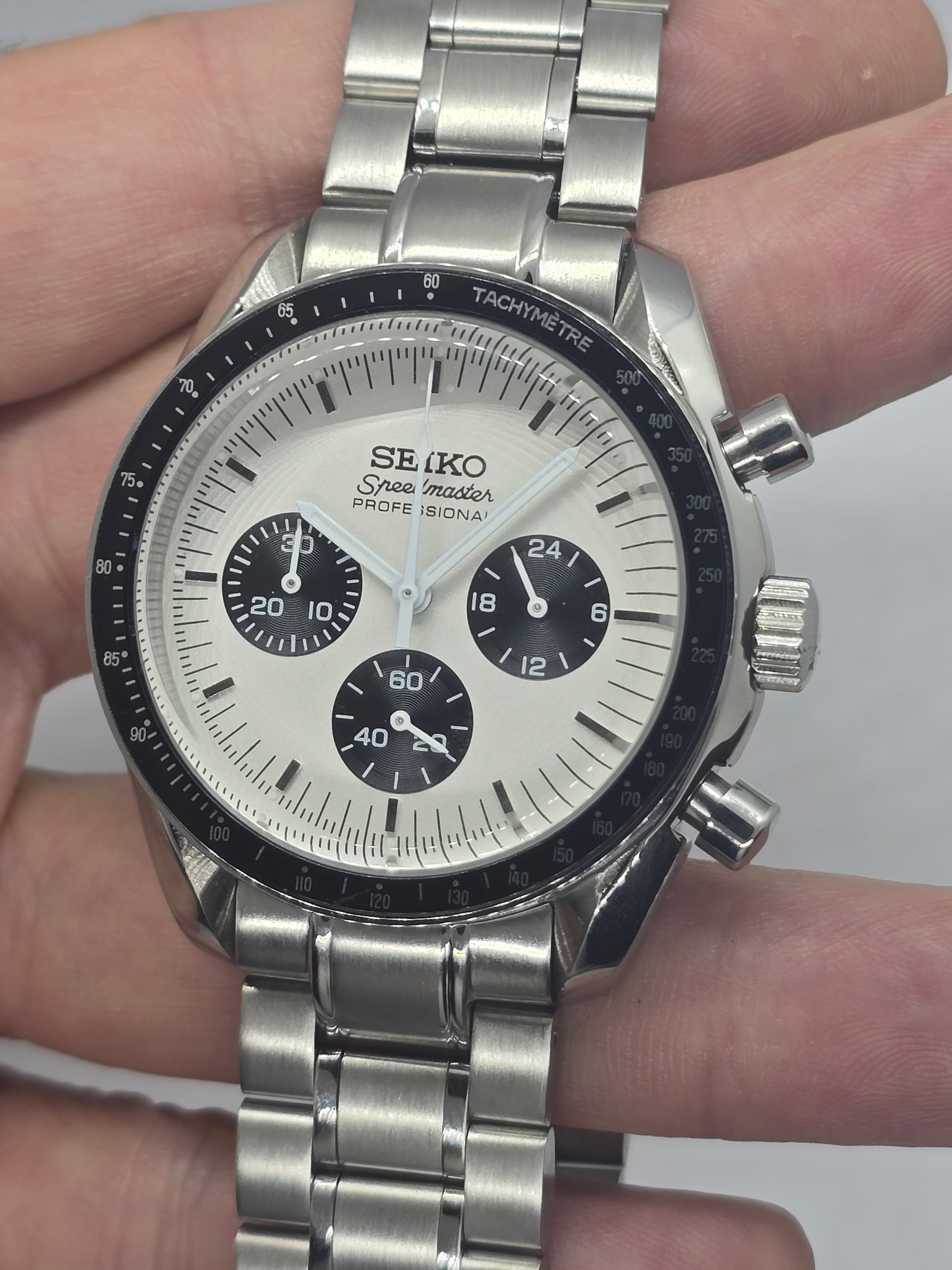 Orologio personalizzato Seiko Mod Speedmaster Moonwatch bianco cronografo.