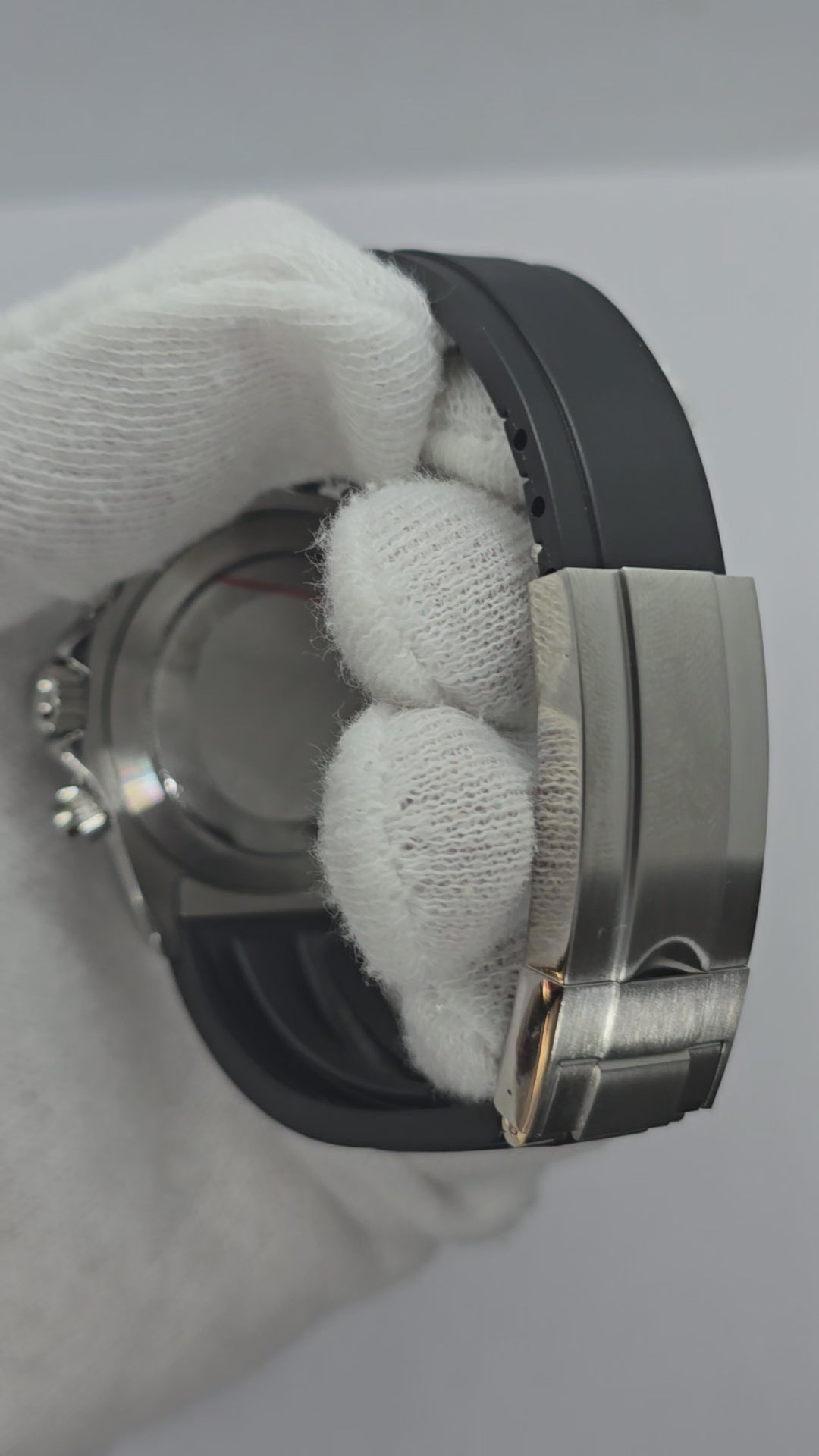 Cinturino nero in caucciù con doppia chiusura di sicurezza e microregolazione.